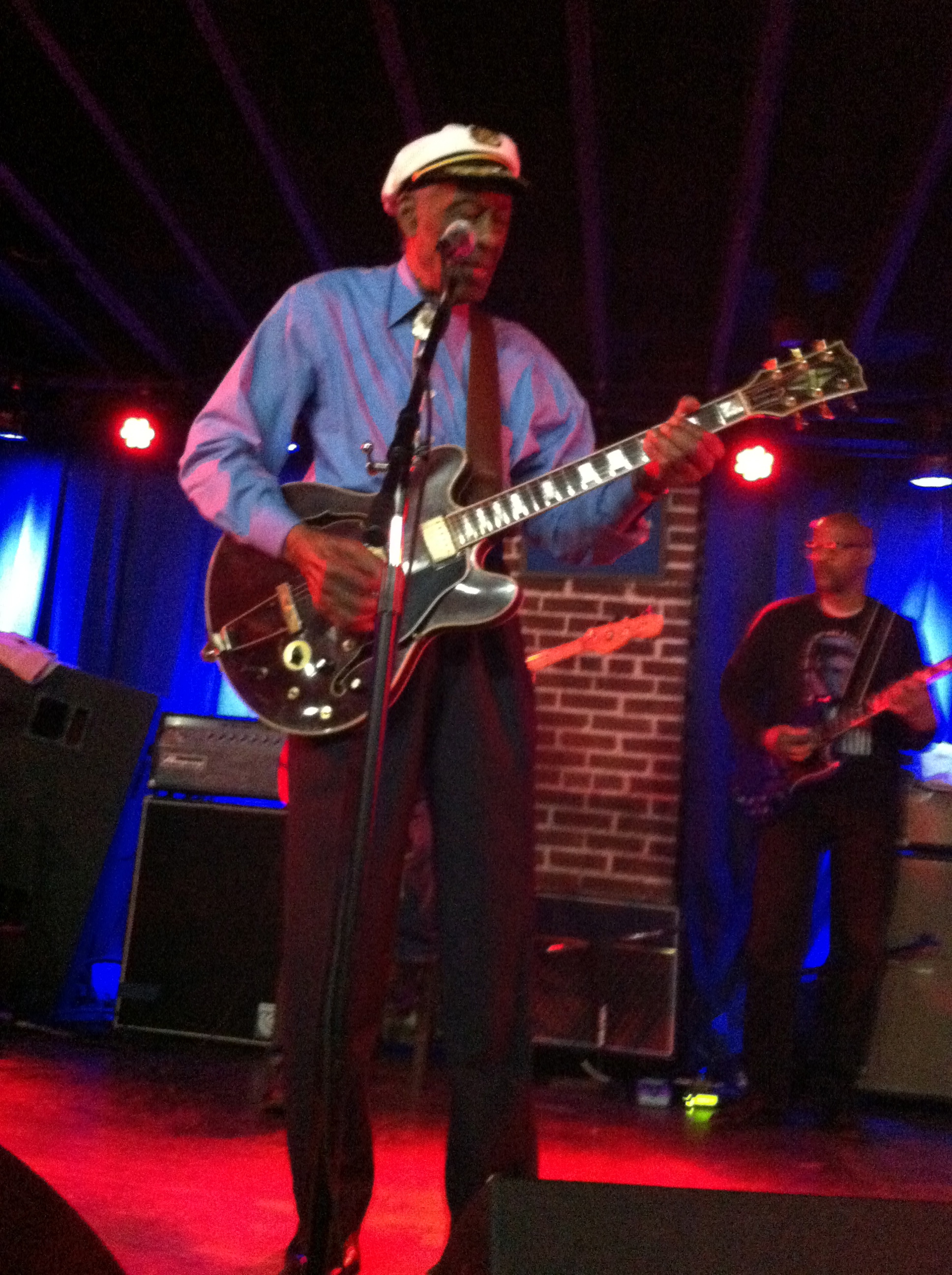 Last night I took my husband Jake to Blueberry Hill for his birthday. We were able to see Chuck Berry perform in the Duck Room after trying to get tickets for five or six years. Since Chuck performs only once a month, you have to gp online immediately as soon as sales start to buy tickets. It was worth the wait: Chuck is 87 and still rockin’ and rollin’. I loved his music when I was a teenager and he was wild and free. I loved him yesterday too. This is certainly a tamer Chuck than the guitar legend. We sat front-row-center and could see how management puts a list of songs with keys in huge letters on the floor. He got the key wrong once anyway to the annoyance of Charles Berry, Jr. who performs along with his Dad and sister Ingrid. Right key, wrong key, April 23rd was Chuck’s 203rd consecutive performance at Blueberry Hill. How cool is that?